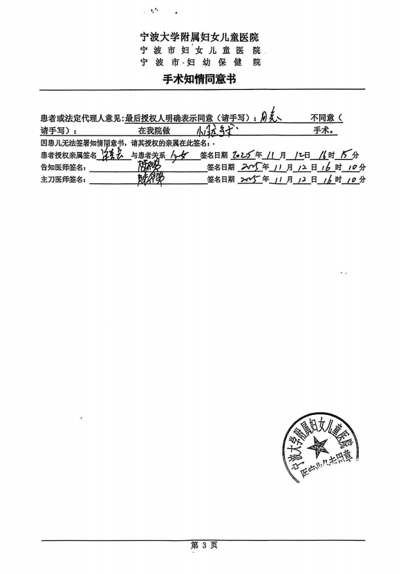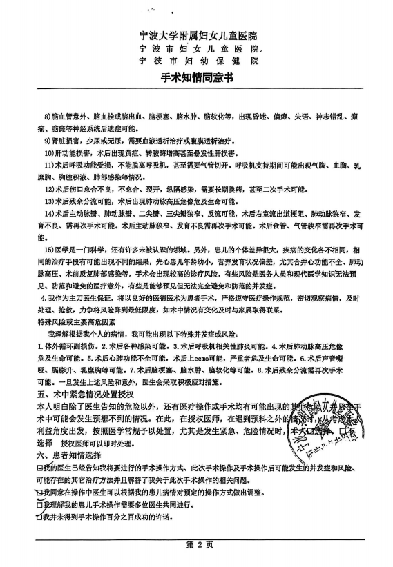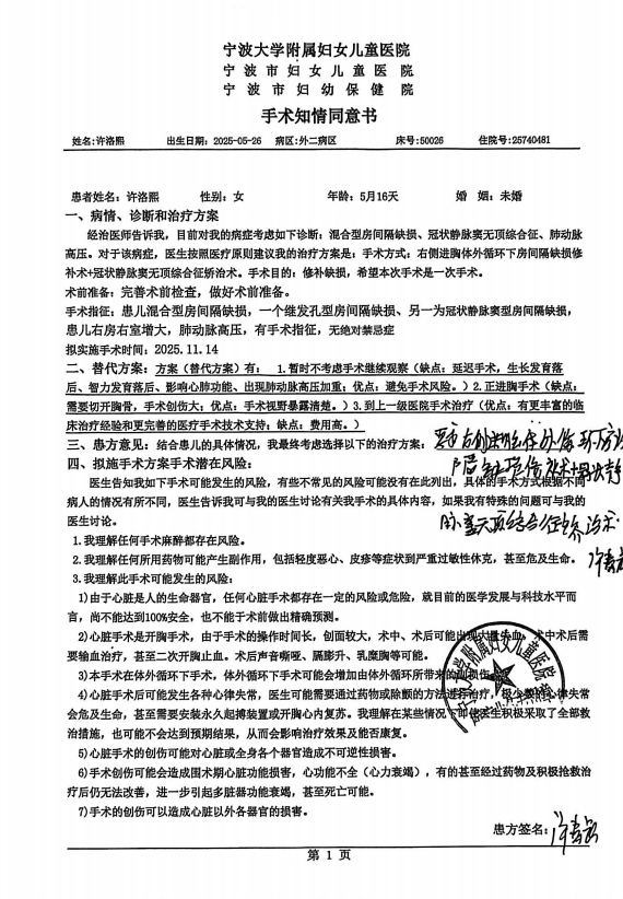 1.《手术知情同意书》铁证:术前已充分告知高危风险。《手术知情同意书》是“风险告知”的法定核心证据,针对性列明19项高危风险,涵盖“肺动脉高压危象”“体外循环损伤”“心功能不全”“二次手术可能”“危及生命”等,且明确标注风险与“早产儿+复杂混合型房缺”的高危属性直接相关;同意书设置“我并未得到手术操作百分之百成功的许诺”选项,家属不仅勾选确认,还由授权亲属签署姓名、亲属关系,签署日期与术前谈话时间完全吻合。若确如家属所述“未告知高危性”,其不可能签署同意书并勾选该条款,该行为本身就是对“风险已知”的明确确认。所谓“成功率99%”,是家属对“普通房缺手术群体成功率”的误解,知情同意书已明确强调洛熙的高危属性,医生自始至终未作出“100%成功”的承诺。